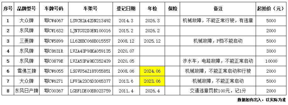 四、特別提醒:拍賣車輛不含車牌號碼,以現(xiàn)狀拍賣現(xiàn)狀交付。